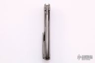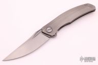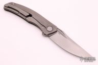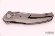 This Quantum by Shirogorov features a blasted blade with notched thumbrest and flipper. The handle has a blasted and milled titanium frame, backspacer, tip up titanium clip with hidden screws. Rides on MRBS, nice detent, lockup and blade seating. Comes with original box and COA. Excellent condition.