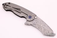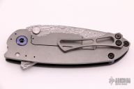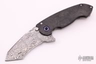 This Solo flipper by Direware features a Damasteel blade with notched thumbrest and flipper. The handle has a bead blasted titanium and marble carbon fiber frame, titanium pocket clip. Smooth flipping action that requires no wrist movement with an early and strong lock up, nice detent and blade seating is dead center.Excellent Condition.
