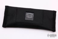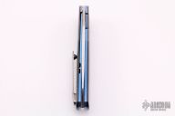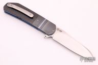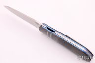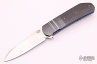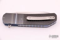 This LL14M flipper by Herucus Blomerus features a hand rub satin finished blade with polished flats, notched thumbrest and flipper. The handle has fluted and textured zirconium bolsters, carbon fiber scales with anodized titanium liners with jimped spine, stainless steel backspacer and a tip up milled titanium clip with ceramic ball. Blade is centered when closed, nice detent and lockup. Very smooth flipping action, rides on Ceramic IKBS. Comes with nylon velcro case and COA. New from maker.