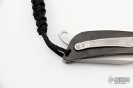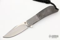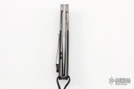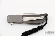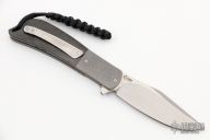 This HB19 Kolobe linerlock flipper by Herucus Blomerus features a stonewash finished blade with polished flats and flipper. The handle has stonewashed zirconium bolsters, marble carbon fiber scales, stonewashed titanium liners, stonewashed stainless steel backspacer with hidden bottle opener, and a tip up milled titanium clip. Blade is centered when closed, nice detent and lockup. Very smooth flipping action, rides on Ceramic IKBS. Comes with velcro case and COA. New from maker.