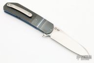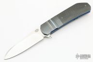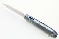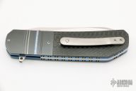 This LL06 flipper by Herucus Blomerus features a hand rubbed, satin finished blade with polished flats, notched flipper. The handle has fluted zirconium bolsters, lightning strike carbon fiber scales with anodized titanium liners with jimped spine, stainless steel backspacer and a tip up milled titanium clip. Blade is centered when closed, nice detent and lockup. Very smooth flipping action, rides on IKBS. Comes with nylon velcro case and COA. New from maker.