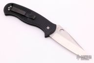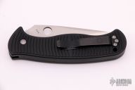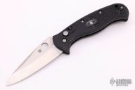 This side opening automatic features a satin finished blade with swedge and thumb hole. Has notched thumb rest. Frame is milled and textured black aluminum with push button and safety. Clip is tip up carry, and reversible for right or left-handed carry. Comes with a Spyderco box. Has some minor wear on the clip and handle, otherwise excellent condition.