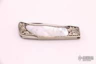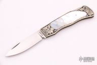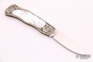 This lockback folder by Jess Horn features a hand rub satin finished blade with nail nick. The handle has an engraved nickel silver frame with mother-of-pearl inlays and stainless steel backspacer. Engraved by "CKM" which is Kimberly Cover. Comes with a zippered case. Excellent condition. #005 on ricasso.