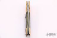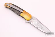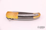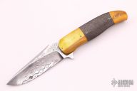 This LL-HH by George Muller features a Damasteel blade with flipper. The handle has dovetailed anodized titanium bolsters, lightning strike carbon fiber scales, anodized titanium liners, stainless steel backspacer, tip up Damasteel clip. Nice detent, blade seating and lockup. Has IKBS. Comes with zippered case. Has a few light scratches, otherwise excellent condition.