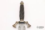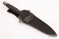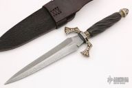 This Dagger by Todd Kopp features a Damascus double-edged blade with .205" blade stock and 1.691" blade depth, hidden tang construction. The handle has engraved sterling silver guard and butt with a spiral fluted ebony grip with silver twisted wire inlays. Comes with a brown leather sheath and zippered case. Has some patina on the guard and butt, otherwise excellent condition.