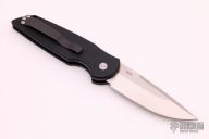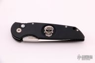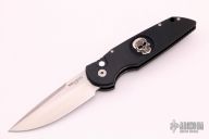 This Tactical Response TR-3 by Pro-Tech black anodized aluminum body, which provides good traction and looks great. The blade is satin finished 154-CM stainless steel with a plain cutting edge. The TR-3 is a knife that won't let you down. It fires hard, locks up like a rock, and feels great in hand. The slim design sits comfortably for tip-up pocket carry. Black Lip Pearl is inset into the firing button, adding a unique and awesome flare to the piece. Sterling Silver Skull in handle. Comes with original box and papers. Excellent condition. #261 of 300
