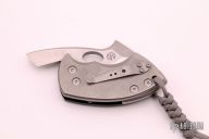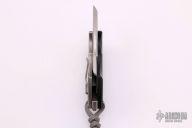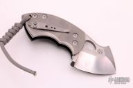This War Toad Friction Folder is a Tuff Knives design executed by Boker. It features a satin finished chisel ground blade with swedge, thumb hole and friction bar. The handle is comprised of textured black G10 "A" side scale and titanium "B" side over a titanium backspacer. Titanium tip up clip and lanyard hole in pommel. Excellent condition.