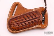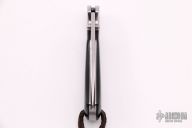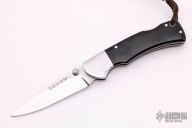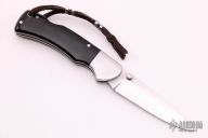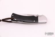 This Metuki Lockback by Murray Carter features a laminated steel blade with carbon core and stainless clad, single thumbstud. The handle has stainless steel bolsters, liners and backspacer, black linen micarta scales, lanyard hole. Comes with a zippered case. #018 on blade. Has a couple light scratches, otherwise excellent condition. Comes with an A&M Leather belt sheath.