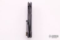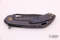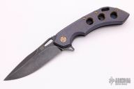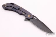 This Wayfarer 247 from Olamic Cutlery features a PVD stonewashed blade, thumbhole, notched thumbrest and flipper. Has a tumbled and anodized titanium frame with matching titanium pocket clip is positioned for tip up carry with a ceramic ball inlay, floating anodized titanium backspacer. The Wayfarer 247 is very comfortable in the hand and flips well with no wrist action needed. Blade is centered when closed and locks up with no play. Comes with maker's card with a serial number of 1026. Includes a padded zippered case. Excellent condition.