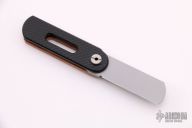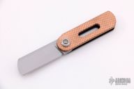 This Ovalmoon by Darriel Caston features a chisel ground and bead blasted blade. The handle is milled copper and aluminum. The frame is held in place by a pivot and magnets. New from maker!