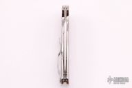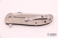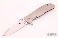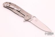 This C214TIP Advocate is a Gayle Bradley design executed by Spyderco. It features a satin finished drop point blade with thumb hole, notched thumb ramp and flipper. The handle is comprised of an orange peeled titanium frame over barrel spacers with a steel tip up clip that is reversible for right or left hand carry. Steel lock face insert and lanyard hole in pommel. Includes original box and papers. Excellent condition.