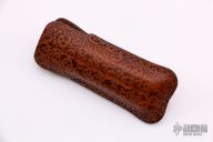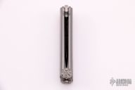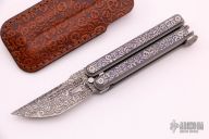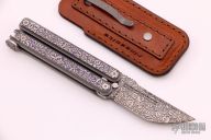 This minature Balisong features a fully laser engraved blade with a false top edge. The handle is composed of engraved titanium. Includes a brown leather slip sheath with a clip. New from maker!