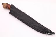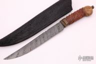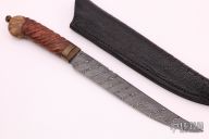 This knife by Fred Ott was the 2018 Devner Custom Knife Show Best Art Knife, it has a Damascus blade with fileworked spine, .228" blade stock and 1.228" depth, hidden tang construction. The handle has a textured bronze guard, spiral fluted amboyna burl wood grip with a bronze finale. Comes with a black leather sheath and COA. Excellent condition.