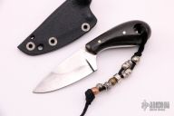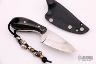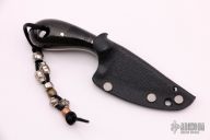 This Pocket Knife by Fred Perrin features a drop point blade with visible temper liner and notched thumbrest, .117" blade stock and .816" blade depth, full tang construction. The handle is comprised of black linen micarta with nickel silver pins. Lanyard hole with lanyard in pommel. Includes kydex sheath. New from maker.