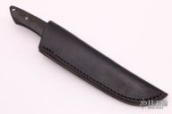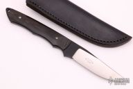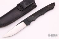 This Utility by Les Voorhies features a satin finished blade with black flats and tang, .140" blade stock and .987" blade depth, full tang construction with black linen micarta scales. Comes with a black leather sheath. Has a little minor wear on the black coating on the tang, otherwise excellent condition.