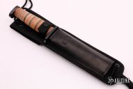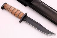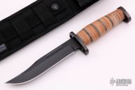 This Model 119BRS-B by Buck Knives features a black finished clip point blade with false top edge and fullers, .177" blade stock and 1.067" blade depth, hidden tang construction. The handle has a black steel guard and butt, and a stacked leather and black linen micarta grip. Comes with black leather/nylon sheath, original box and papers. Excellent condition.
