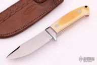 This Nessmuck Hunter by Jim Martindale features westinghouse micarta scales with red liners and a mirror polished stainless steel guard. Full tapered tang construction with .165" blade stock and 1.09" blade depth. Mirror polished blade. Includes a hand tooled brown leather sheath with belt loop and COA. #173 on blade. New from Maker!