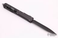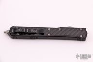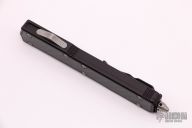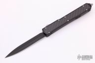 This Makora II by Microtech, (S/N 00776 08/2008) has a black double-edged blade with fullers. Handle is black aluminum with black carbon fiber overlays, bead blasted hardware and glass breaker, and black stainless steel tip down clip. Has some wear on the clip, otherwise excellent condition.