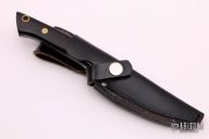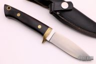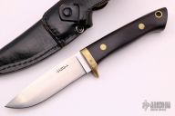 This Hunter from Hattori features a drop point satin finish blade with false top edge, .191" blade stock and 1.013" blade depth. The Handle has a brass guard and pins with wood scales over full tapered tang construction. Lanyard tube in pommel.  Includes a black leather sheath with belt loop.  Scratches are visible on the handle and blade otherwise the knife is in fair condition.  This knife would make a greater user.