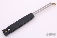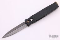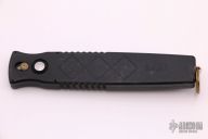 This Centurion OTF by S.W.A.T. is a push button single action automatic with single edge spearpoint blade with black finish. T6 black aluminum handle with hatched pattern milling. Blade is retracted by depressing button and pulling recharge handle in the butt. Slide safety. Has some scuffs, otherwise good condition. One side of the blade is hand signed "SN. 033" and the other side says "SANTANGELO".