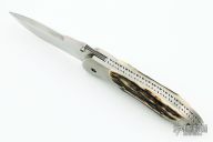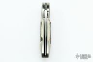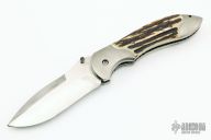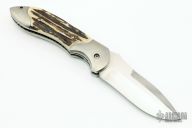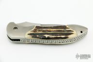 This Classic Prototype Linerlock folder by Todd Fischer Sr features a satin finish blade with a false top edge and a single thumbstuds with stag inlay. The handle has orange peel finish titanium double bolsters, stag scales, titanium liners with jeweled interiors, and a fileworked titanium backspacer. Smooth action. Nice blade seating, detent, and lockup. Has a few light scratches, otherwise excellent condition.