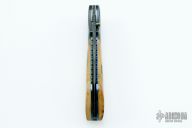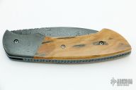 This Hawkbill Linerlock folder by Todd Fischer Sr features a Damascus blade with fileworked spine and a single thumbstud with mammoth ivory inlay. The handle has dovetailed Damascus bolsters, mammoth ivory scales, anodized and fileworked titanium liners with jeweled interiors, and a fileworked Damascus backspacer. Smooth action. Nice blade seating, detent, and lockup. Has a few light scratches, otherwise excellent condition.