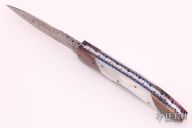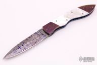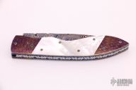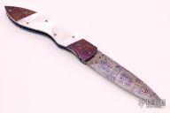 This D/A Scale Release auto from Steve Busch features a blue Raindrop Damascus blade with file worked spine, it had a thumbstud, but it has been removed. The handle has blued mosaic damascus bolsters, mother-of-pearl scales over fileworked and anodized titanium liners, fileworked stainless steel backspacer. Nice action, lockup and blade seating. Has some scratches, otherwise excellent condition.