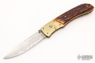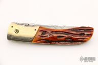 This Button Lock by Bill King features a Damascus drop point blade with a ruby inlaid thumbstud. The handle has anodized and orange peel finished titanium dovetailed  bolsters, amber jigged bone scales, anodized and fileworked titanium liners, fileworked and heat colored stainless steel backspacer. Nice lockup and blade seating. Has a couple light scratches, otherwise excellent condition.