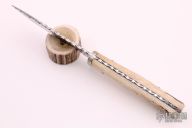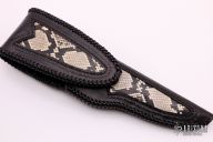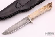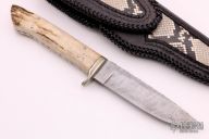 This Hunter by John Harbuck features a Damascus blade with fileworked spine, .137" blade stock and 1.101" blade depth, full tang construction. The handle has a textured nickel silver guard with stag scales and nickel silver pins, fully fileworked tang. Comes with a black leather sheath with Python Skin inlays done by Dave Cole. Has some light scratches, otherwise good condition.