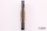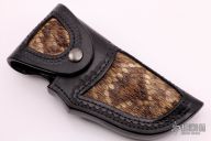 This linerlock by Larry Pridgen features a Damascus blade with fileworked spine, notched thumbrest and single thumbstud. The handle has dovetailed Damascus bolsters, mammoth ivory scales, fileworked and anodized titanium liners, fileworked Damascus backspacer. Comes with a black leather sheath with Python skin inlays by Dave Cole. Nice detent and lockup. Excellent condition.
