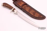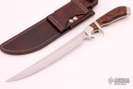 This Blue Water Fillet by Lonnie E Davis features a mirror polished blade with .123" blade stock and .947" blade depth, full tang construction. The handle has dovetailed nickel silver bolsters, nickel silver sub-hilt and pommel, stabilized palmwood scales with black liners. Comes with a hand tooled brown leather sheath by David Cole. Excellent condition.