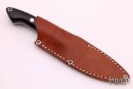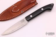 This Hunter from Bark River features a satin finished blade, .135" blade thickness and .930" blade depth, full tang construction. The handle has black canvas micarta scales with aluminum pins and lanyard hole. Comes with a brown leather sheath.  This knife has been poorly resharpened otherwise the knife is in good condition.  This knife would make a great user.