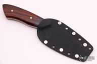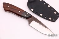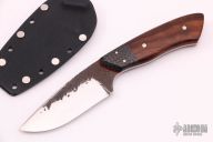 This Kajiki by Murray Carter features a hand forged blade with hammered flats, .143" blade thickness and 1.285" blade depth, full tapered tang construction.  The handle has carbon fiber bolsters, wood scales over red liners.  Comes with kydex sheath. Scratches are visible on the blade otherwise the knife is in good condition.