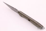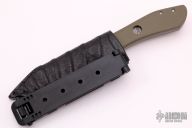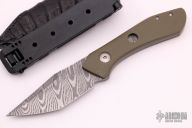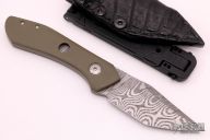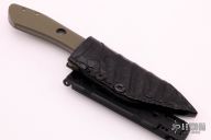 This Prima by Brandon Corbin features a Mike Norris Fireclone 2 Damascus blade with false top edge and notched thumbrest, .118" blade stock and 1.219" blade depth, full tang construction. The handle has green G-10 scales. Comes with a black alligator leather sheath with molle clip. Comes with a COA. Excellent condition.