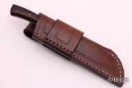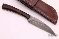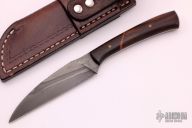 This knife from Eli Jensen features a wharncliffe blade with a nice hamon, file worked blade spine and a tapered tang construction.  .123" Blade Stock.  .954"Blade Depth.  The handle features wood scales.  Includes a brown leather sheath.  Light oxidation is visible on the blade otherwise the knife is in fair condition.