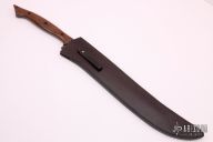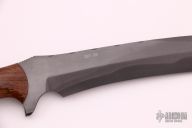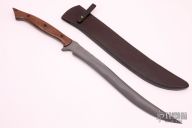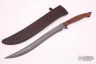 This Windstorm Sword from Dawson Select features a recurve blade with nice hamon, a false top edge and fileworked spine, .238" blade stock and 1.697" blade depth, full tang construction. The handle has ironwood scales. Includes a brown leather sheath. Excellent condition. "Dawson Select" on the blade as well as "2017 001"