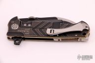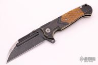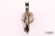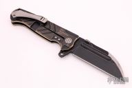 This Tac Butcher by Andre De Villiers features a black tumble finished blade with fullers, notched flipper and titanium thumbdisc. The handle has a black tumble finished titanium frame with polished edges and hardware, orange C-Tek inlay in frame and backspacer, tip up satin and tumble finished titanium tip up clip with roller. Rides on bearings, nice detent, lockup and blade seating. Comes with zippered case. Dated 2017. Excellent condition.
