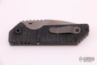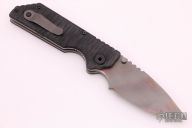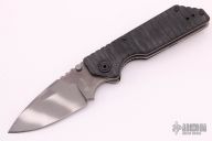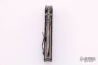 This is an AR linerlock by Duane Dwyer features a tiger striped chisel ground drop point blade with dual thumbstuds, notched thumbrest. The handle has black G-10 scales, titanium liners, bead blasted titanium tip up clip. Notches on thumbrest, lockup and rear of spine. Nice detent and lockup. Excellent condition.