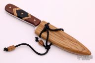 The Distinguished Gentleman by Tim LeGare features a satin finished blade with fileworked spine, .183" blade stock and 1.325" blade depth, full tang construction. The handle has leopard wood scales with black paper micarta and oak wood accents. Comes with an Oak sheath finished with Danish oil and Renwax and black paracord. Comes with COA and original box. New from maker.