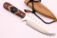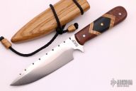 Tim realized that stone knives could easily shatter, which lead him to start experimenting with steel, actually dismantling the swing set his children had outgrown, and turning that steel into several different knife blades. This is when he learned to bevel, shape, and heat-treat the blades. He continues to make knives out of stone, as well as quality handmade stainless steel knives with a variety of handle materials, including granite, Micarta, and many natural woods, even incorporating wood from trees in his own backyard in Florida. He is open to suggestions for custom pieces.