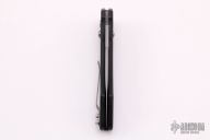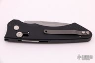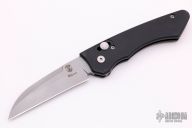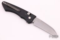 This Waco, side opening coil spring automatic by Rob Dalton features a bead blasted wharncliffe blade with swedge and black anodized aluminum frame. Bead blasted reversible titanium clip, tip up carry. The bar lock release is used to open and close the knife and can be operated with either hand. Numbered 321 on the back of the frame. Has some light scuffs, otherwise excellent condition.