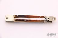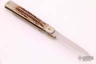 This leverlock auto by Hubertus features a spear point blade, nickel silver double bolsters, stag scales, and brass liners and pins. Opens with a nice snap. Very fast opening. Excellent condition.