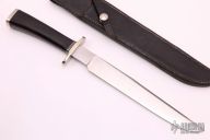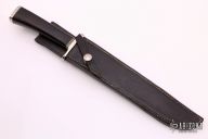 This is Fighter by Don Hastings features a satin finished blade with a nearly sharpened top edge, .230" blade stock and 1.161" blade depth, hidden tang construction. The handle has a nickel silver guard and butt, dark rosewood grip, and black/nickel silver spacers. Comes with a brown leather sheath. Has some light scratches, otherwise excellent condition.
