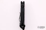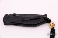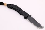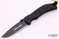 This auto by Combat Elite features a black blade with notched thumbrest. The handle has black aluminum scales with black stainless steel liners and tip up clip, left or right reversible. Has safety on the spine. Excellent condition.
