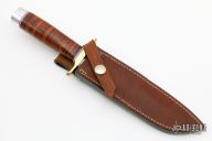 This Model 1-6 Replica by Gary Hicks features a mirror polished blade with false top edge, .250" blade stock and 1.140" blade depth, hidden tang construction. The handle has a brass guard, aluminum butt, stacked leather grip with red/white/blue spacers. Comes with a brown leather sheath. Excellent condition.