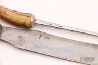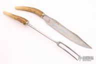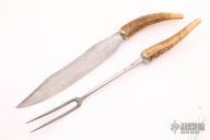This Carving Set by William Scagel features a carving knife with stag handle and nickel silver guard, .111" blade stock and 1.376" blade depth, hidden tang construction. Comes with a matching carving fork. Both have some scratches and patina, but otherwise good condition for their age. Comes with a zippered case.