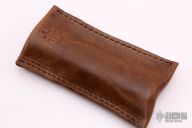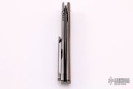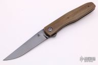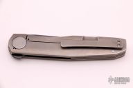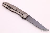 This drop point Flipper by Jason Clark features a gun blued blade with a notched flipper tab. The handle has a canvas micarta scale over titanium liners with a titanium tip pocket clip and a stainless steel backspacer.  Nice detent, lockup and blade seating. Comes with a leather slip sheath and COA. New from maker.
