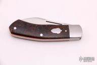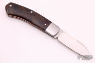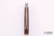 This Dino by David Taber features a hand rub satin finished blade with nail nick. The handle has stainless steel bolsters, vintage Russian Rag Micarta covers with a stainless steel shield escutcheon, orange G-10 liners, stainless steel liners and spring. Has half-stop, flush in all positions. Comes with COA and a leather slip sheath. New from maker.