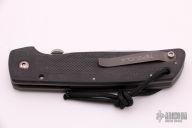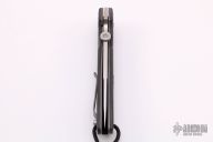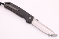 This ATCF linerlock folder by Bob Terzuola features a tumble finished spear point blade with notched thumbrest and thumbdisc. The handle has injection molded carbon fiber scales, bead blasted titanium liners and tip up bead blasted titanium clip. Nice detent, blade seating and lockup. Excellent condition.