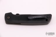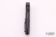 This ATCF linerlock folder by Bob Terzuola features a black spear point blade with notched thumbrest and thumbdisc. The handle has injection molded carbon fiber scales, bead blasted titanium liners and tip up bead blasted titanium clip. Nice detent, blade seating and lockup. Excellent condition.
